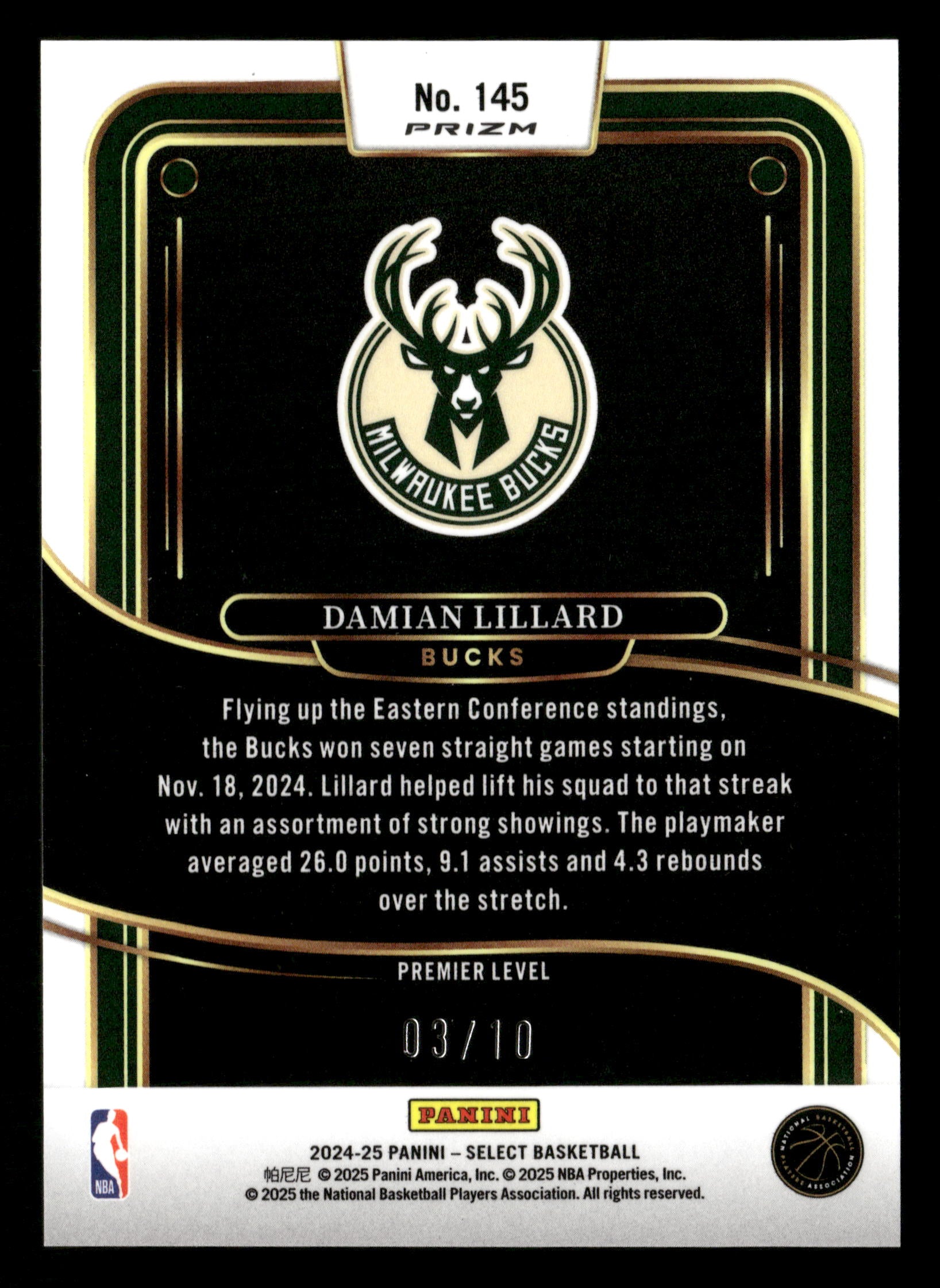 2024-25 Panini Select Basketball No.145 Damian Lillard Gold Premier Level /10