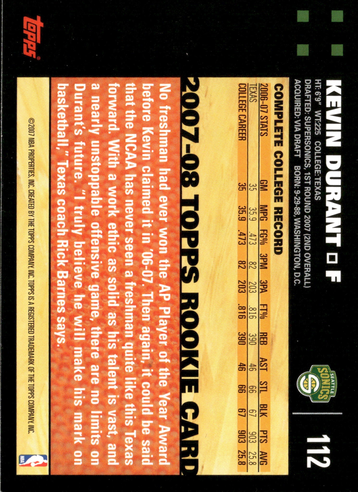 2007-08 Topps No.112 Kevin Durant Black RC Rookie