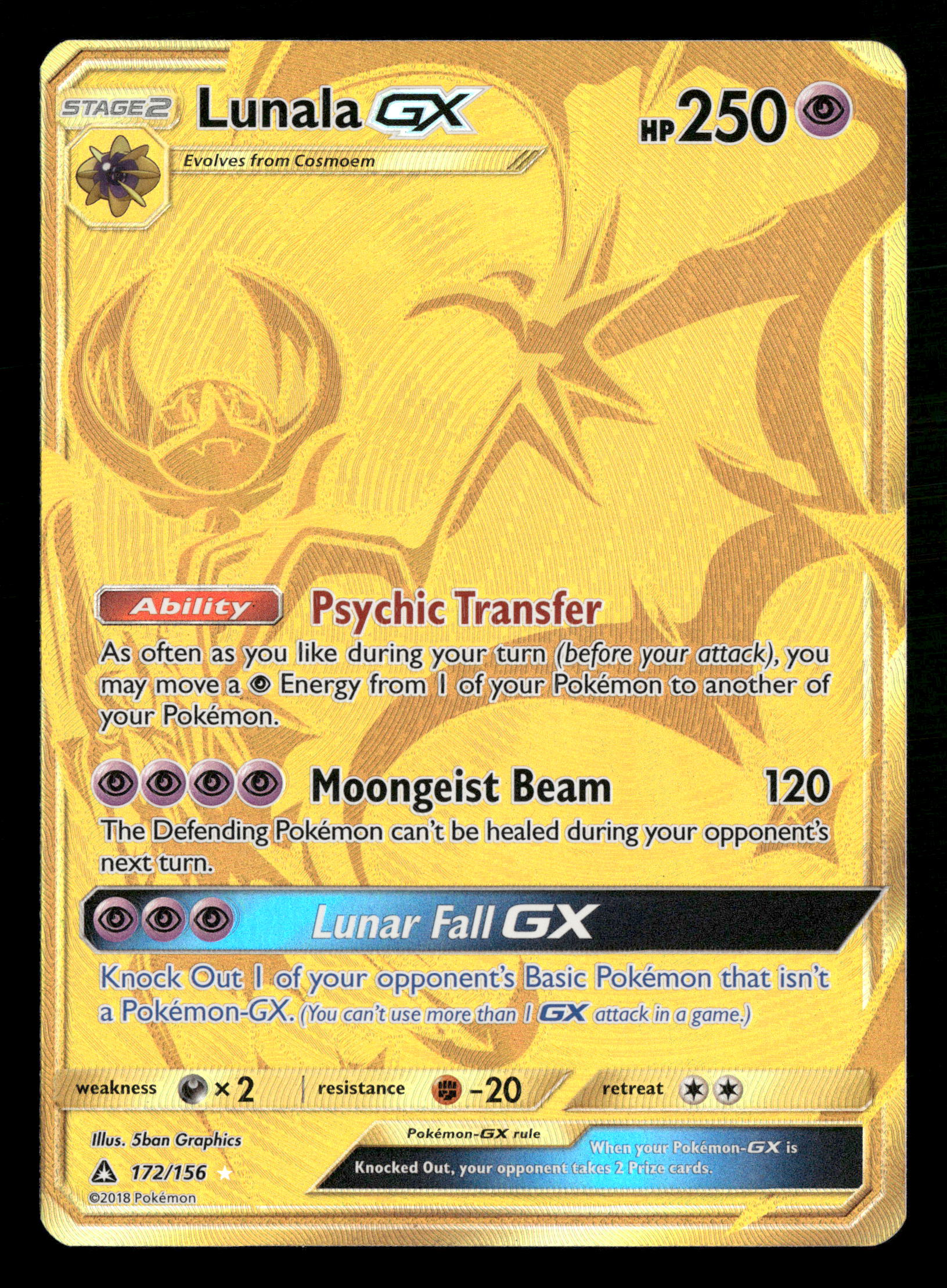 2018 Pokemon SM Ultra Prism 172/156 Lunala GX Gold Secret Rare