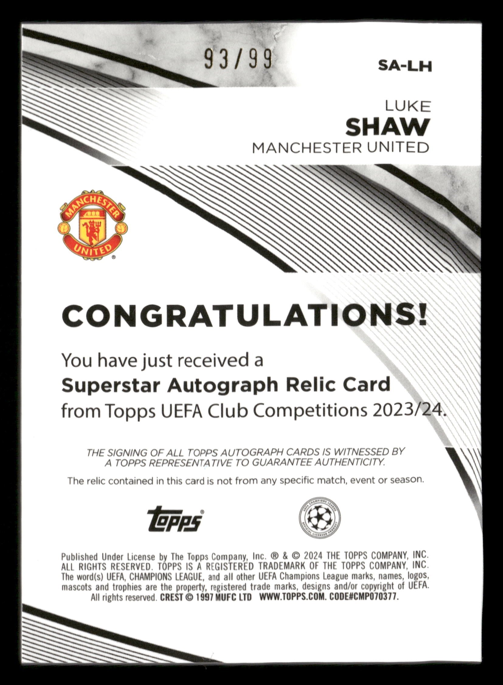 2023-24 Topps UCC Superstar #SA-LH Luke Shaw Autograph Relic /99