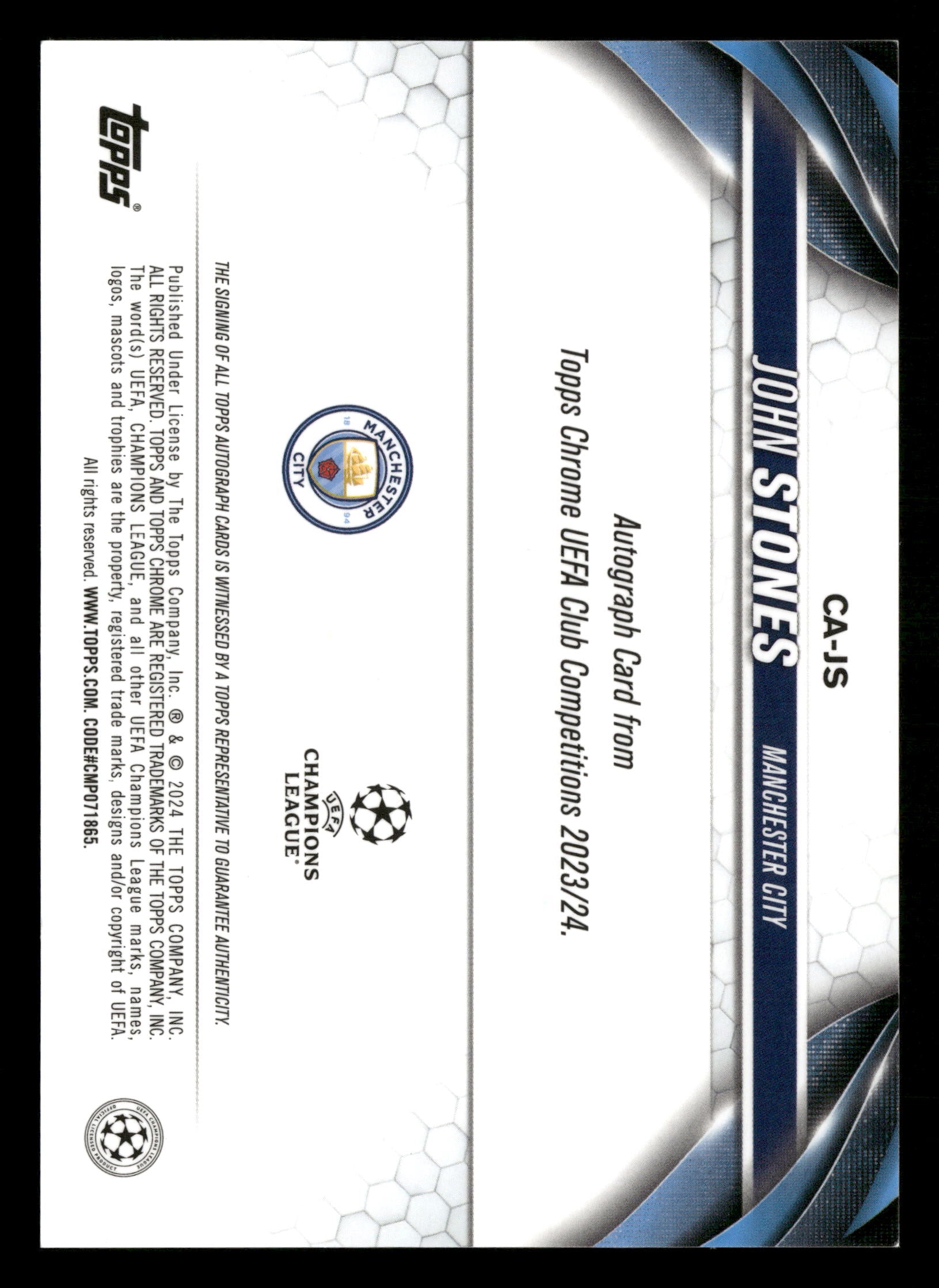 2023/24 Topps Chrome UEFA Club Competitions John Stones Blue Auto 146/150